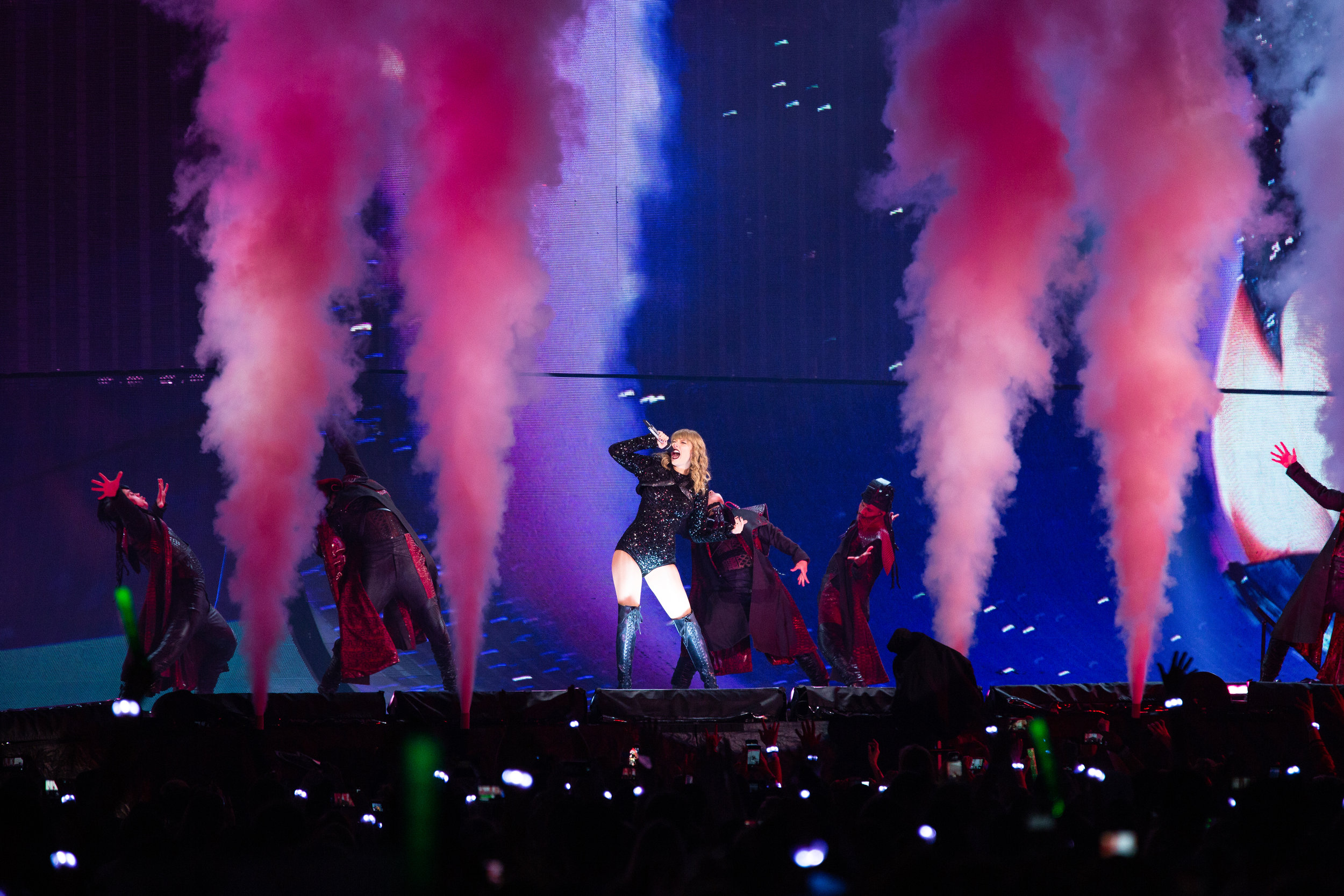Finally, as the opening performances drifted into the background, it became time for Swift to make her presence known. Setting the stage, literally, the 110 foot tall LED backdrop came to life and began playing a video montage that prepared fans for the experience of a lifetime. At the close of the video, the stage began to split in half, dead center, slowly, and reveal a hooded Swift walking out to center-stage with a mic in hand. The noise and screams of the stadium crowd were immediately deafening.